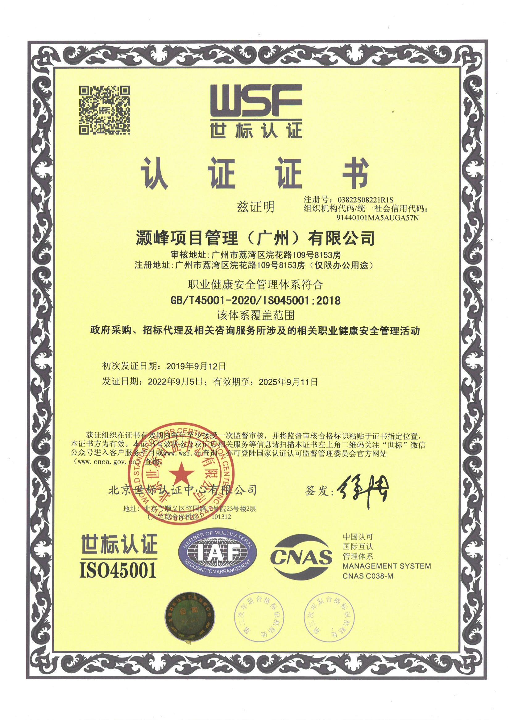 职业健康安全管理体系认证证书