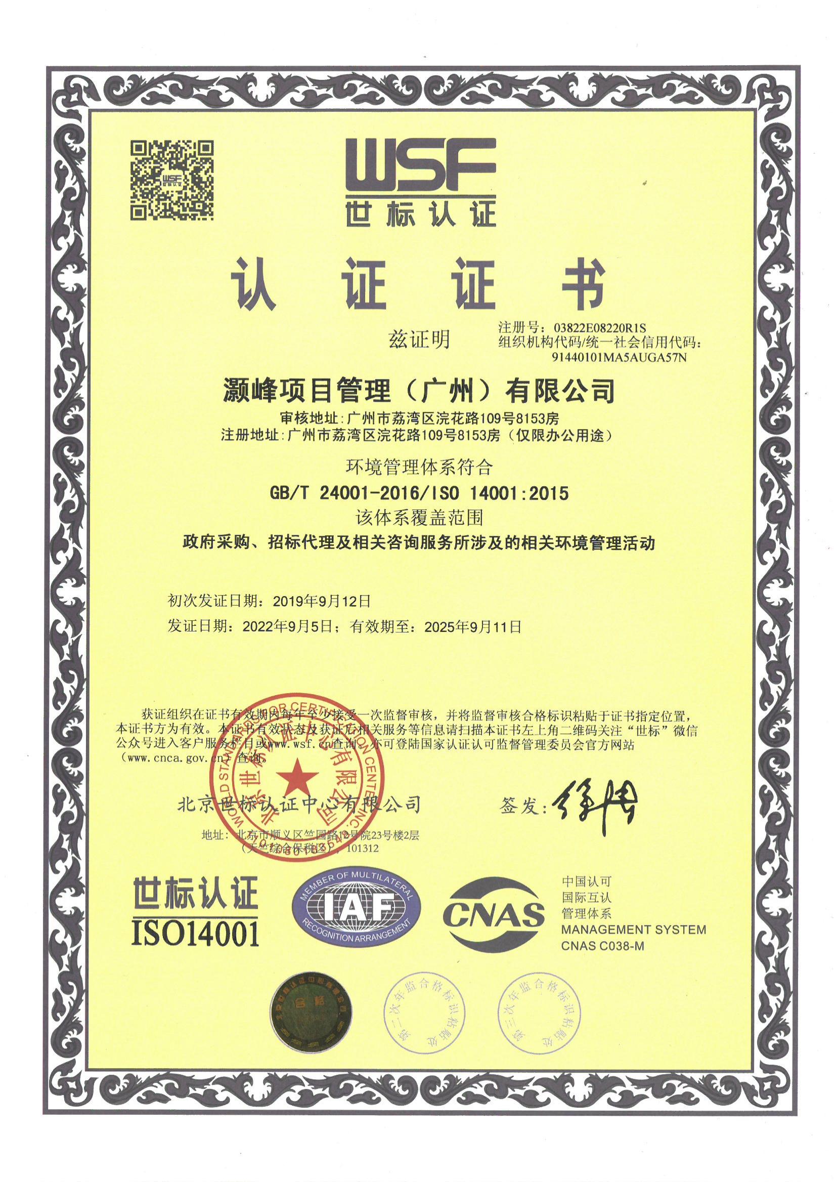 环境管理体系认证证书