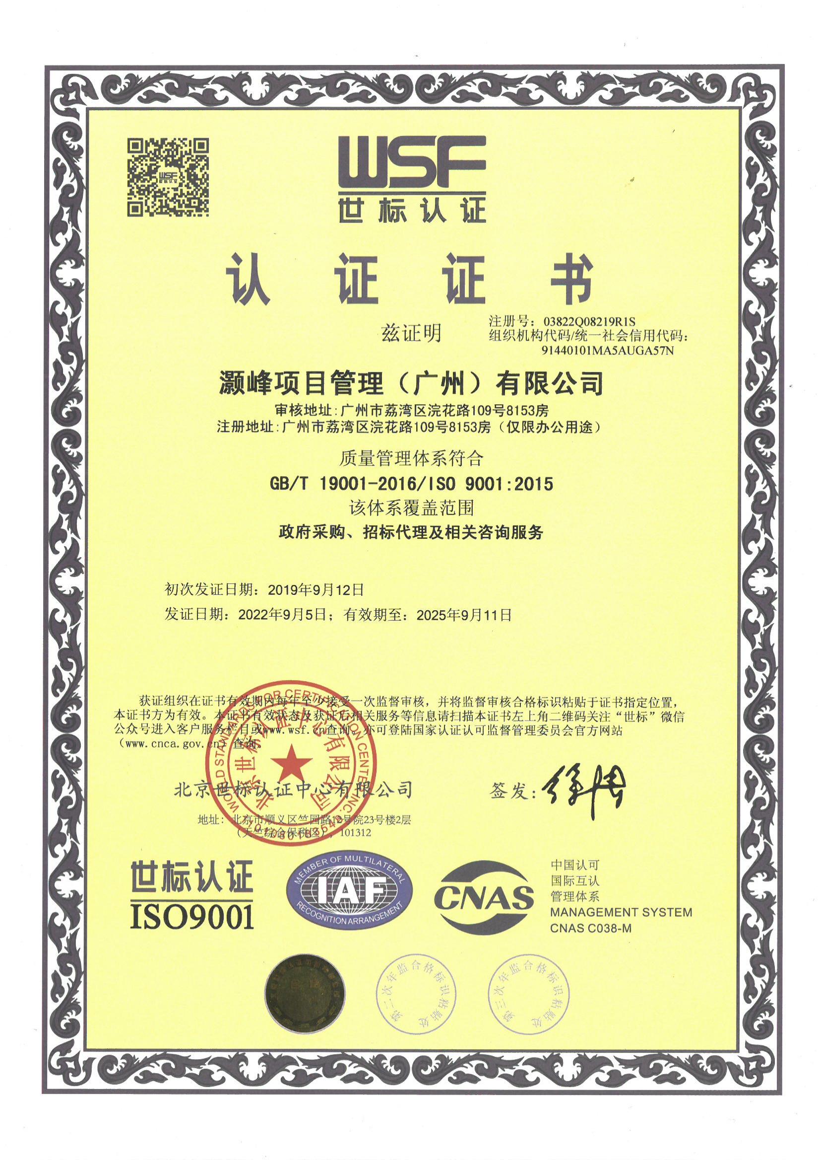 质量管理体系认证证书